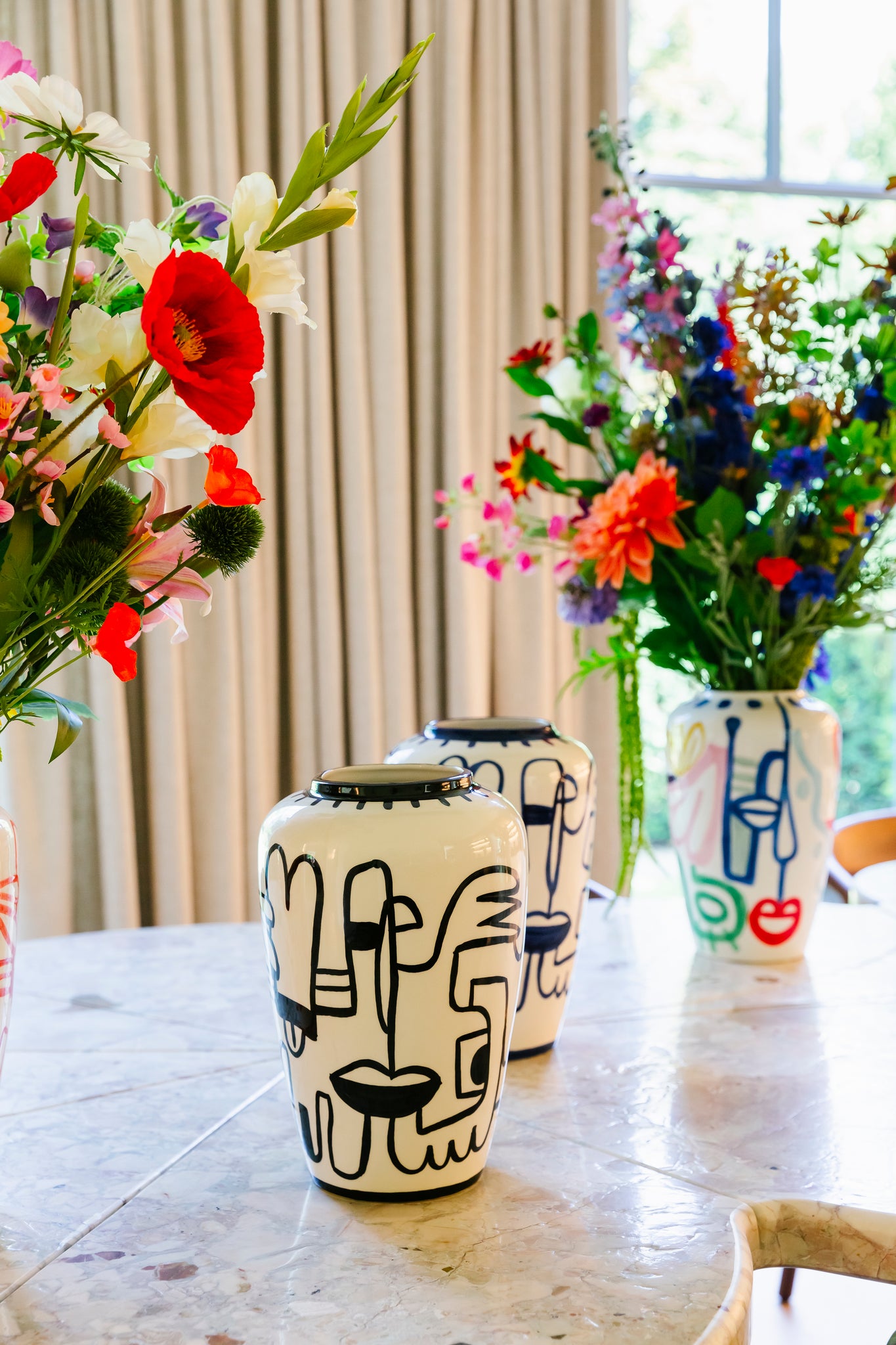 De handgeschilderde Noir-vaas is een expressief designstuk waarin ambacht, speelsheid en artistiek gevoel samenkomen. Deze handgemaakte keramieken vaas, ontworpen door Val Pottery en beschilderd in samenwerking met Julie Loeckx, geeft elke ruimte een unieke toets van kleur en karakter.