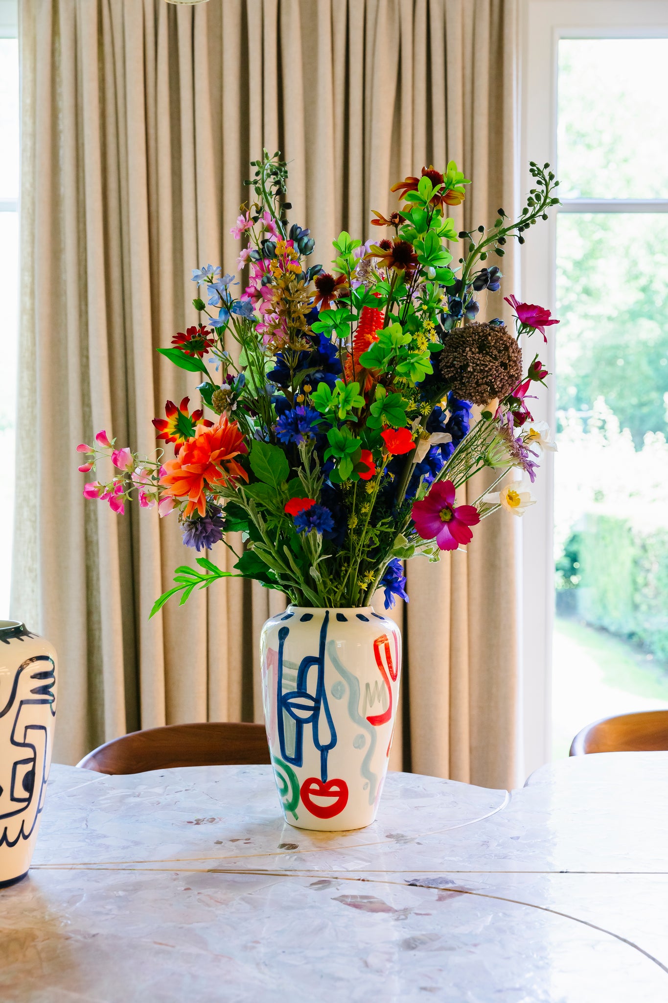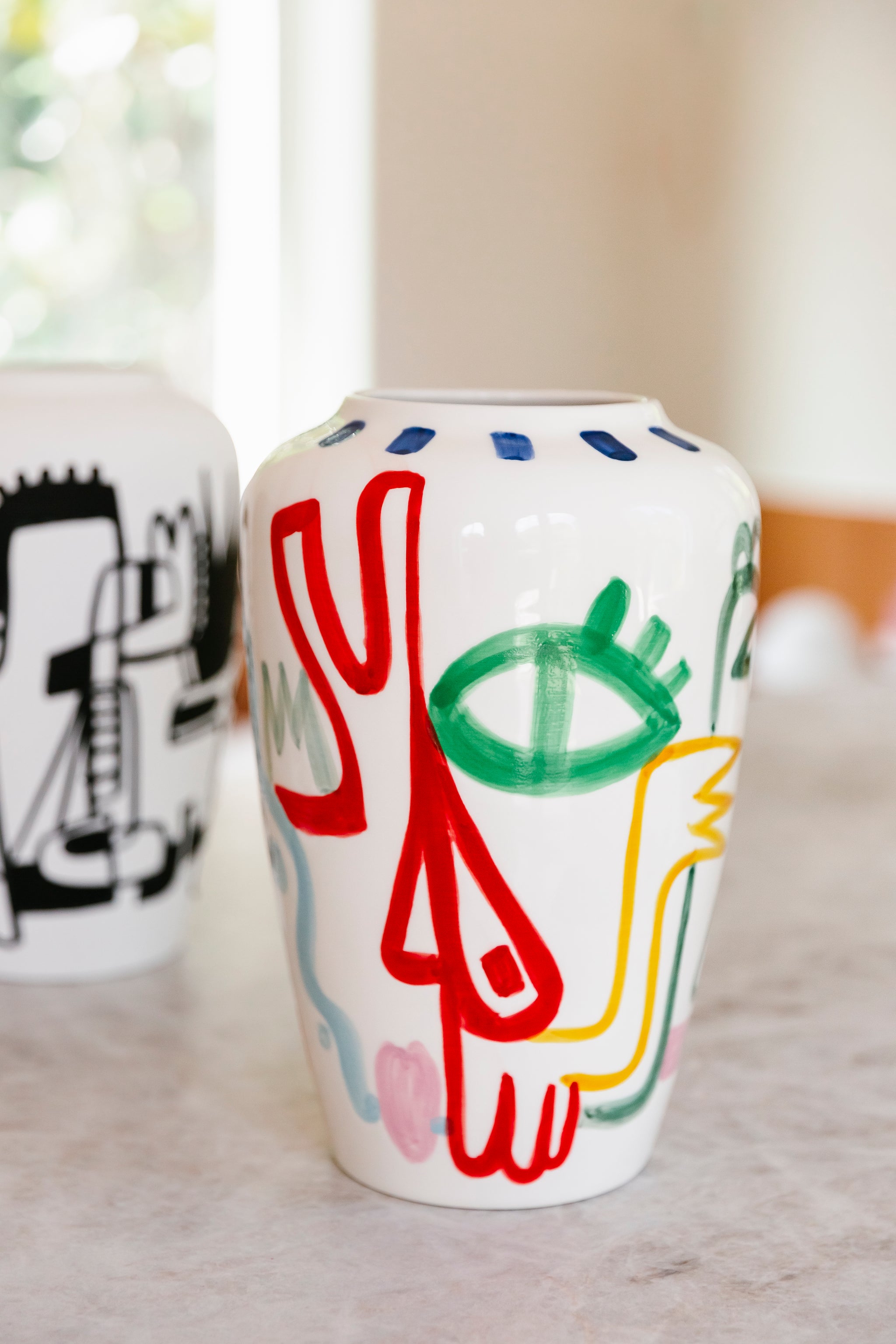 De handgeschilderde Raya-vaas is een expressief designstuk waarin ambacht, speelsheid en artistiek gevoel samenkomen. Deze handgemaakte keramieken vaas, ontworpen door Val Pottery en beschilderd in samenwerking met Julie Loeckx, geeft elke ruimte een unieke toets van kleur en karakter.