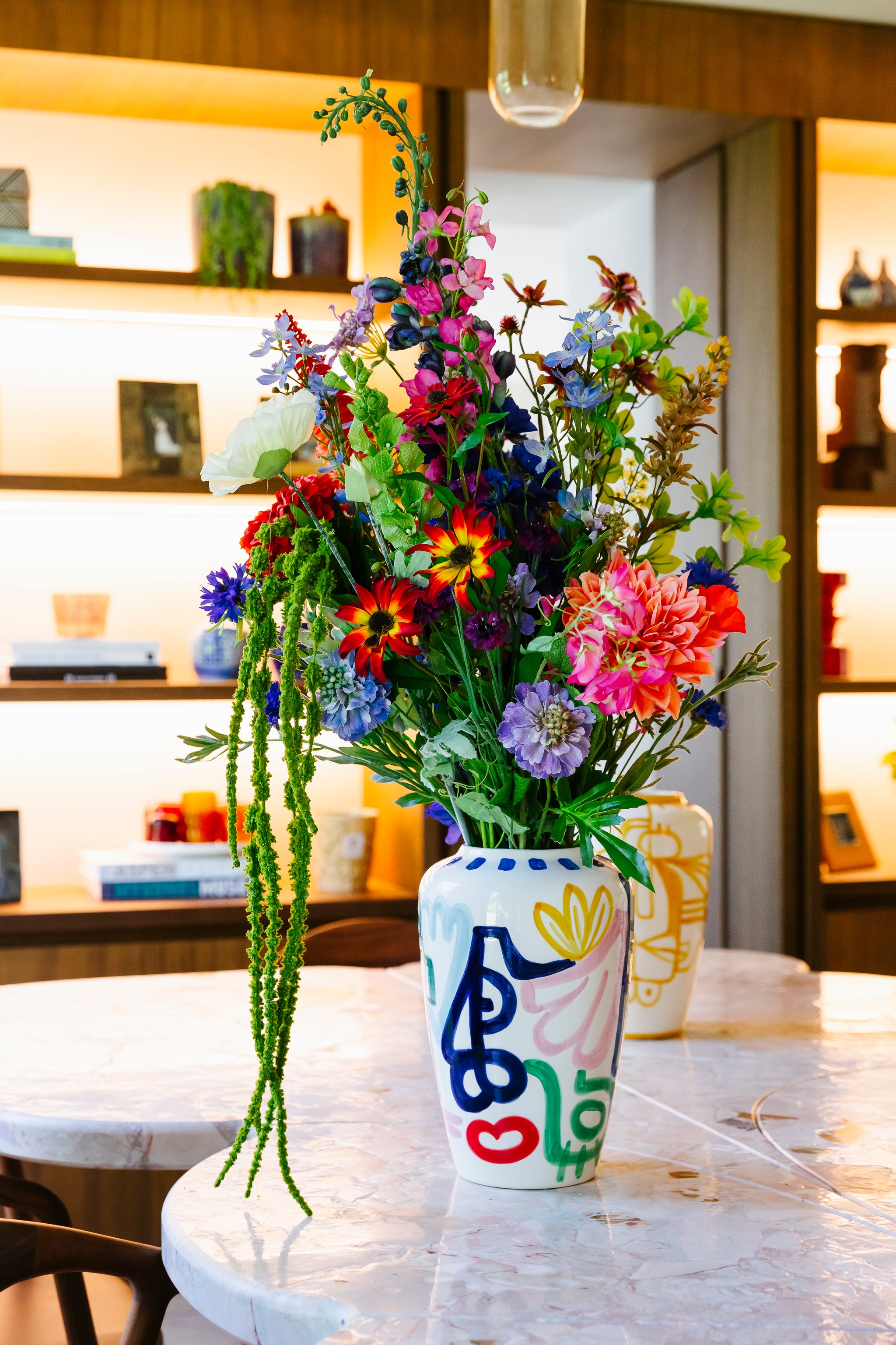 Elk exemplaar is met de hand vervaardigd in Portugal, waardoor kleine variaties het stuk een eigen persoonlijkheid geven. De vaas komt zowel tot zijn recht met bloemen als op zichzelf — een subtiel statement waarin creativiteit, vakmanschap en kleurvolle elegantie moeiteloos samenkomen.