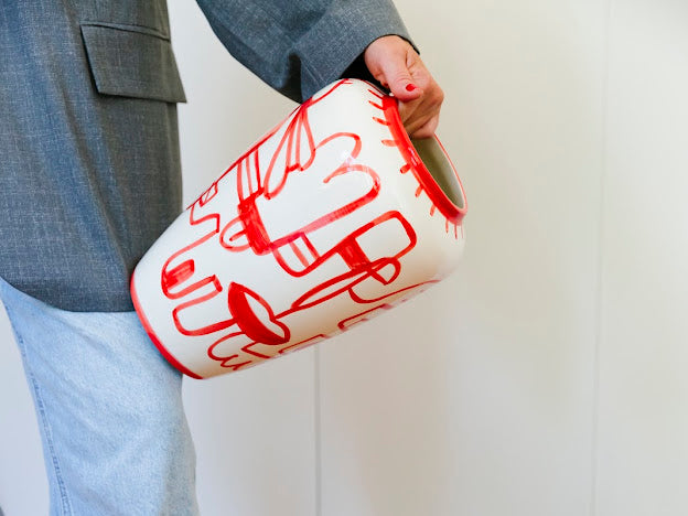 De handgeschilderde Rubi-vaas is een expressief designstuk waarin ambacht, speelsheid en artistiek gevoel samenkomen. Deze handgemaakte keramieken vaas, ontworpen door Val Pottery en beschilderd in samenwerking met Julie Loeckx, geeft elke ruimte een unieke toets van kleur en karakter.