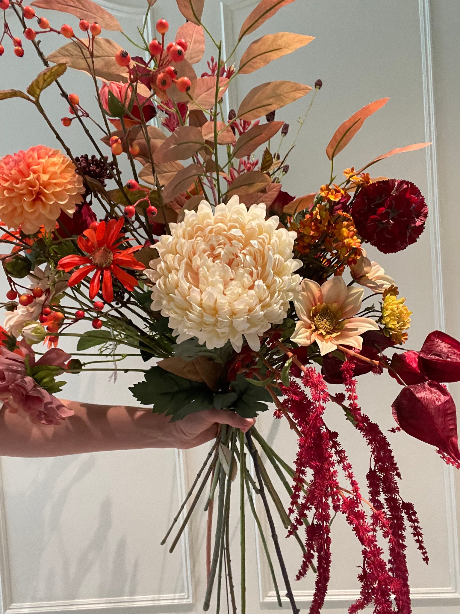 Een elegant zijden boeket , rijke, warme tinten van bordeaux, koper en oranje brengen direct gezelligheid. Een opvallende blikvanger in najaarssfeer.