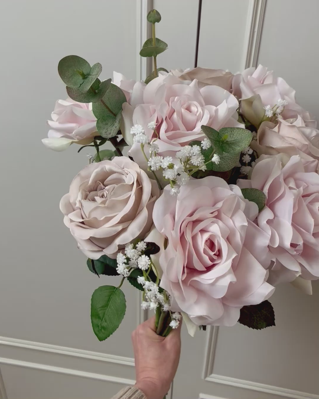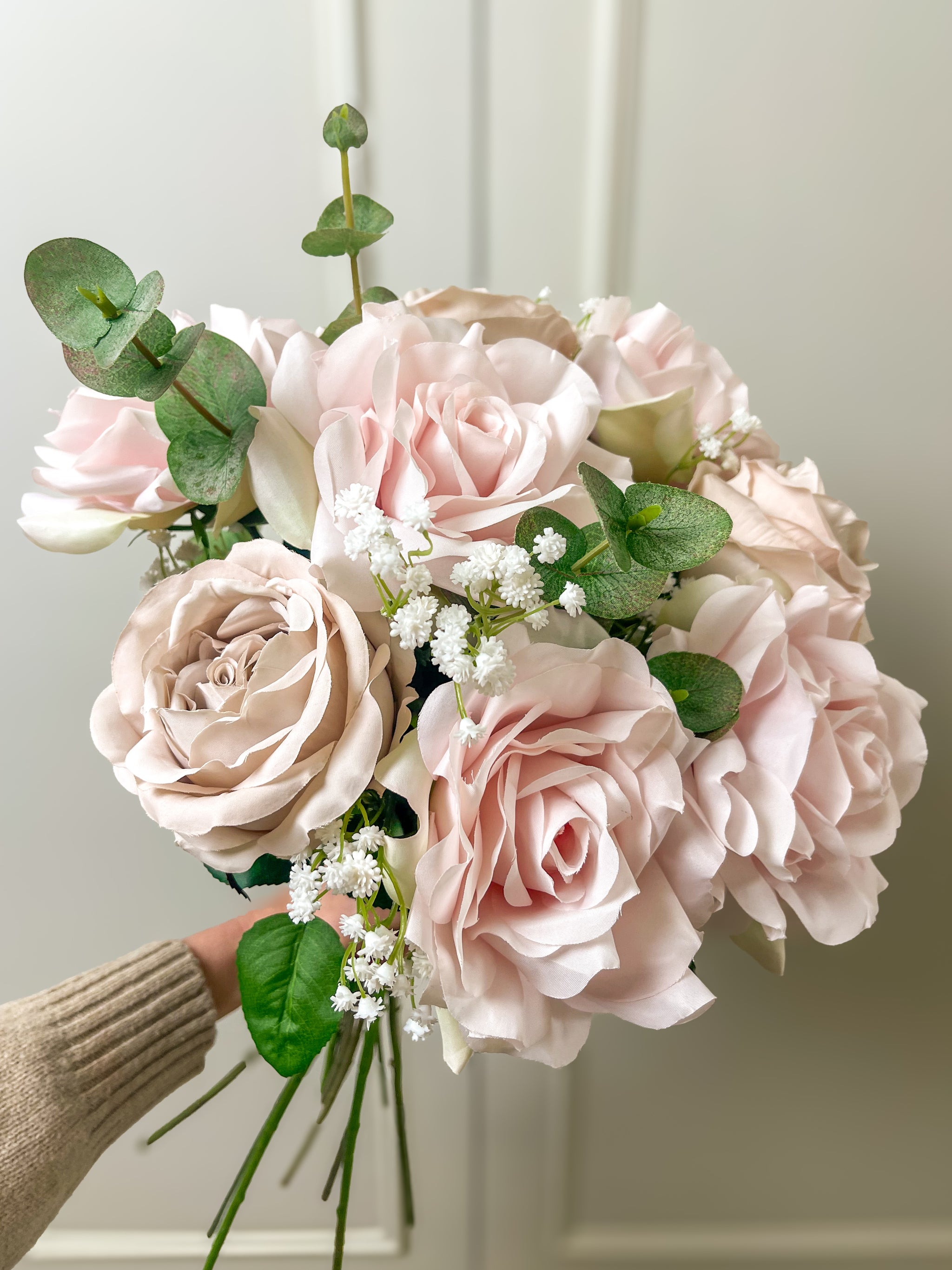 Timeless Love is een elegant premium zijden boeket in zachte blush- en nude tinten, gecombineerd met eucalyptus en fijne witte accenten.